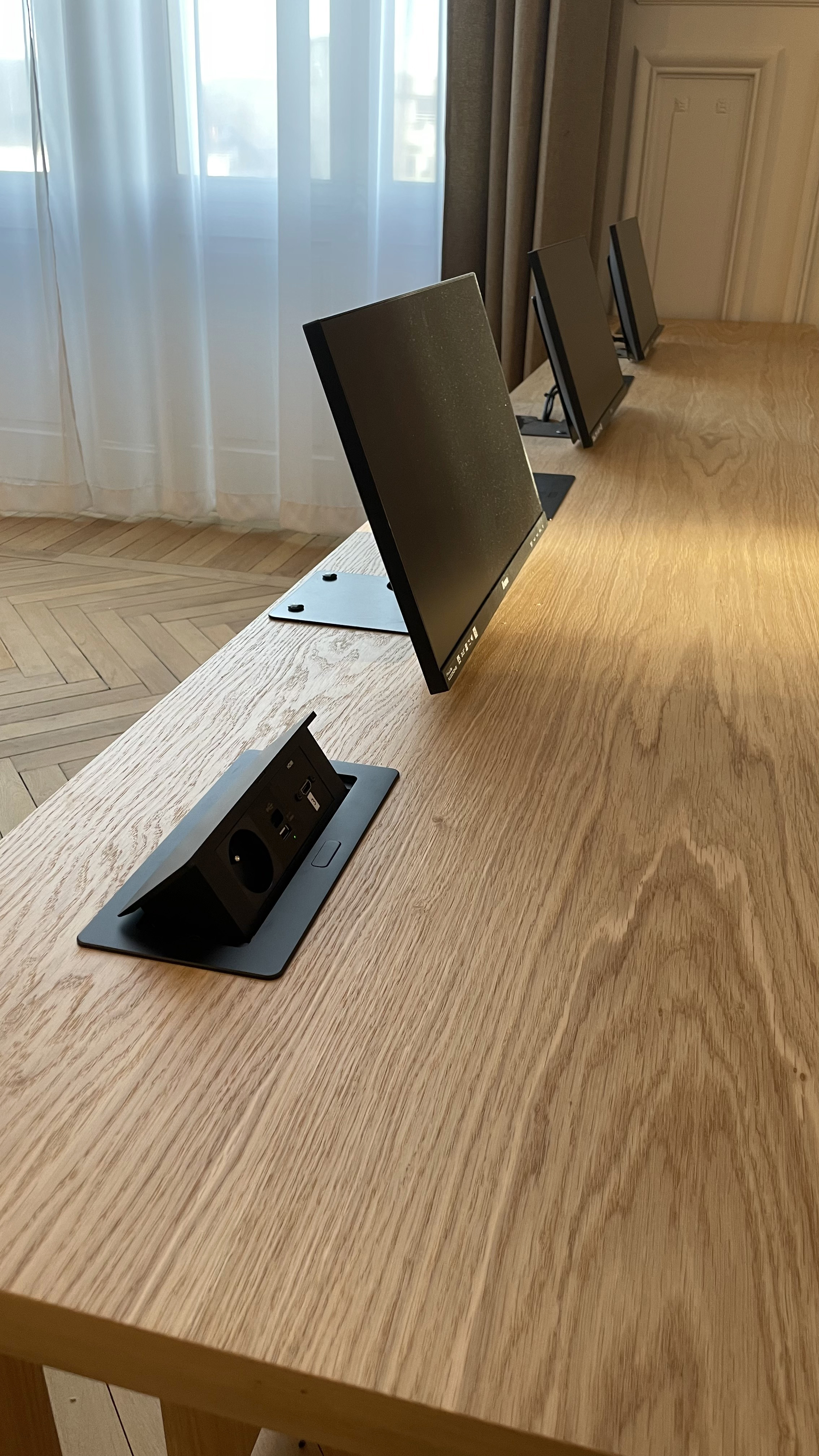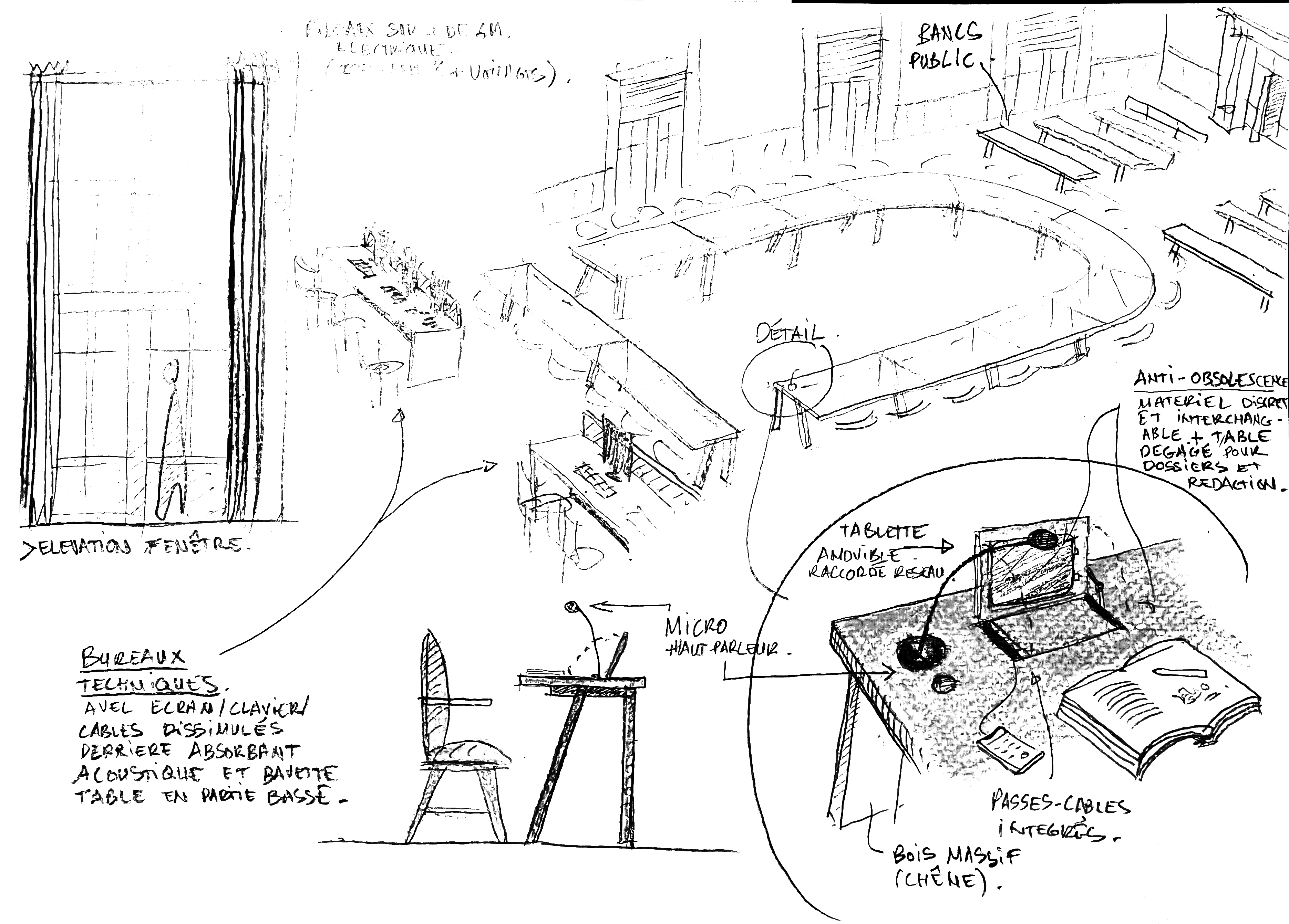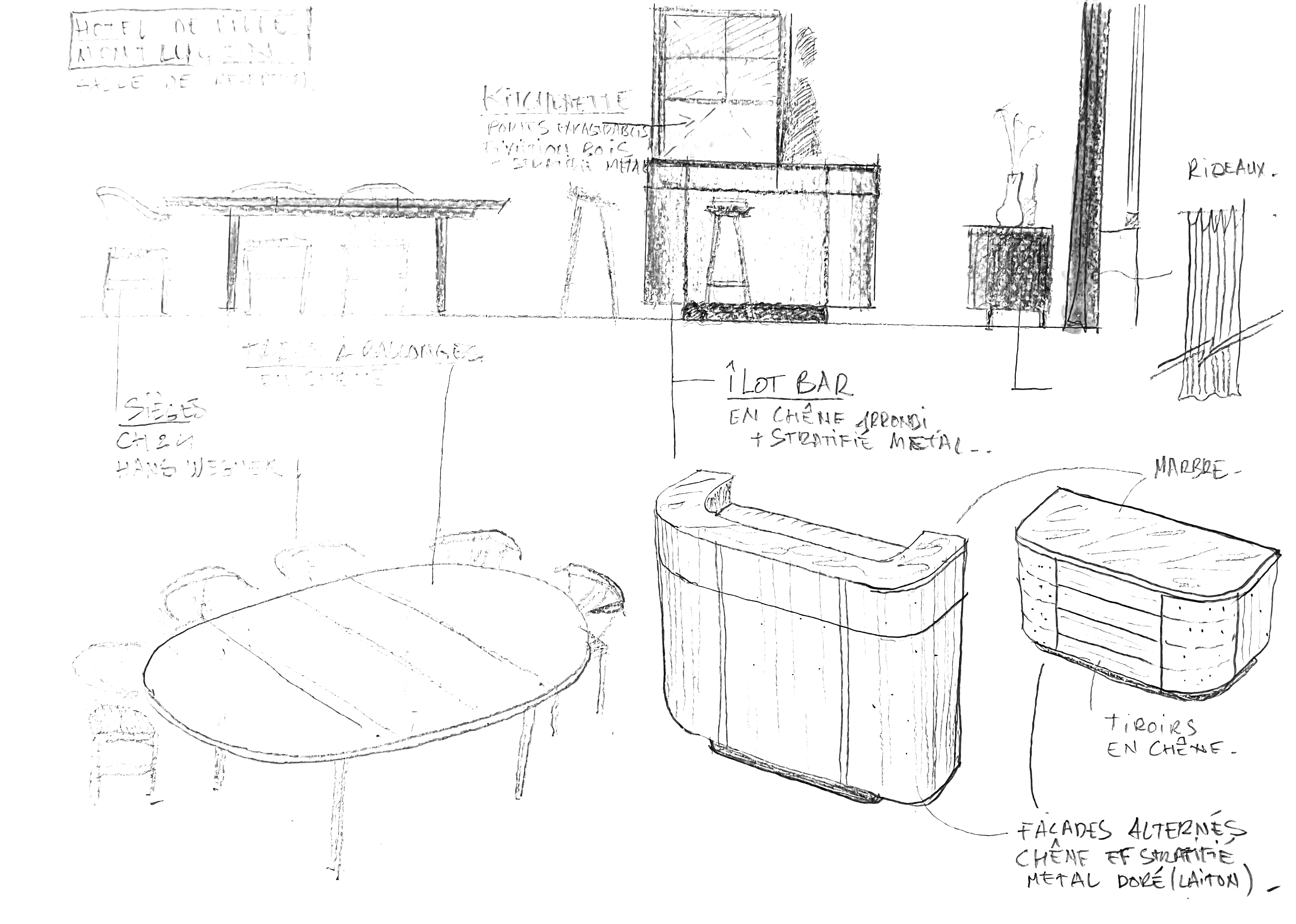 Le chêne massif provient de la forêt de Tronçais du département de l’Allier, la pierre naturelle des plans de travail est une pierre de Volvic, le mobilier existant en chêne de la salle du conseil a été restauré et en partie réadapté avec des équipements numériques intégrés.