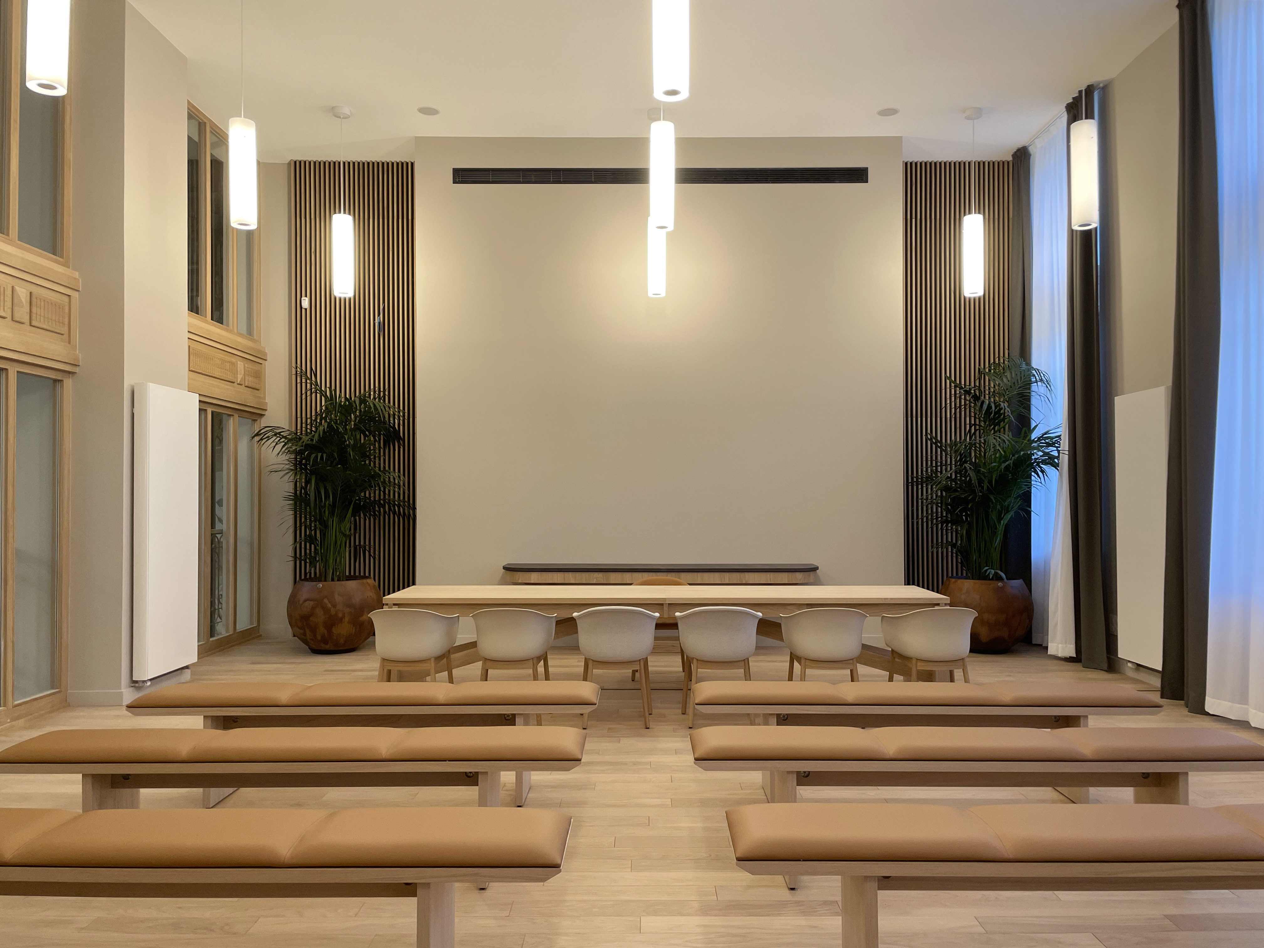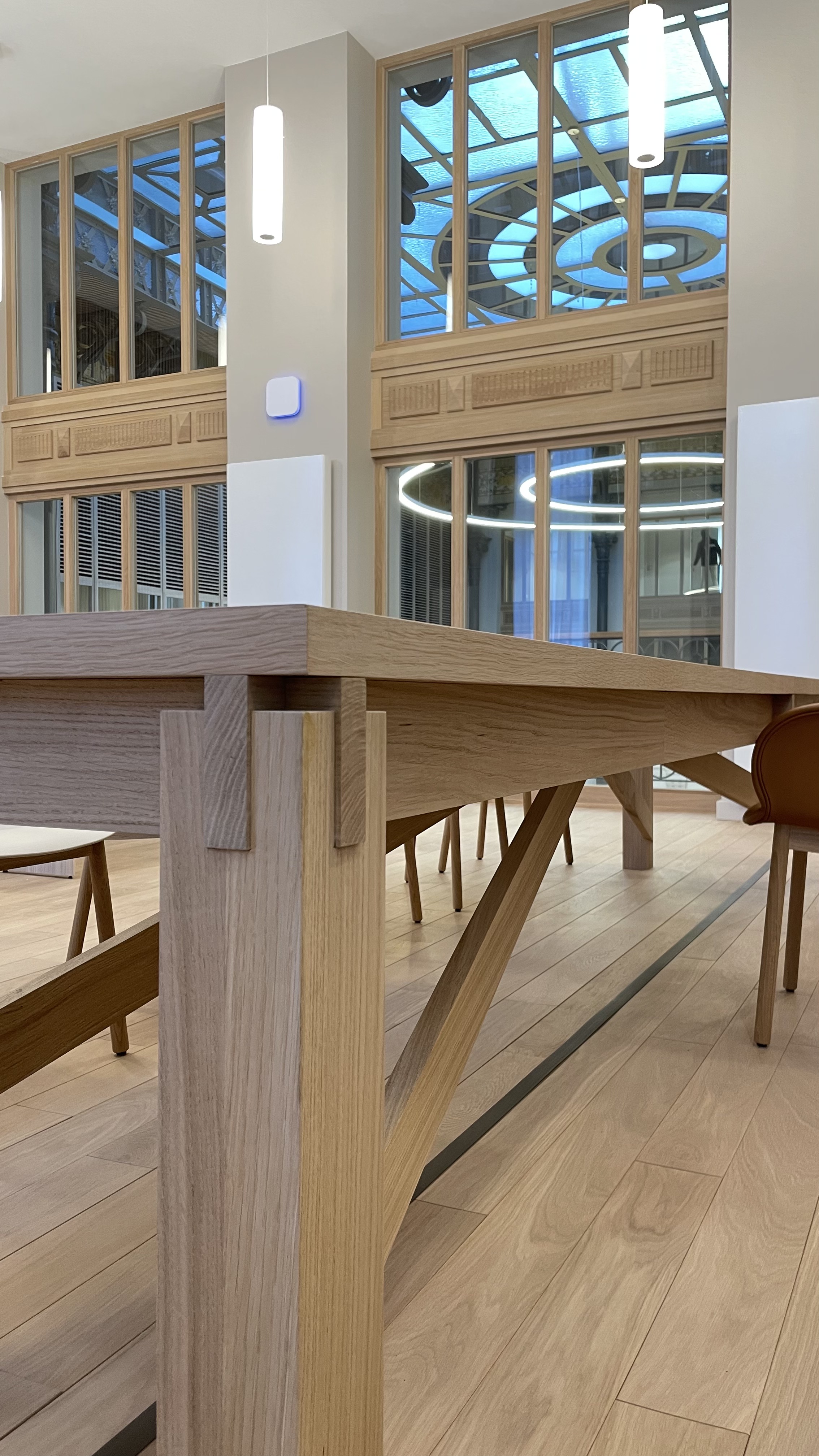 Dans un respect de l’esprit du lieu, une ligne de mobilier dessinée sur mesure a été créée pour répondre à toutes les contraintes d’usages des espaces.