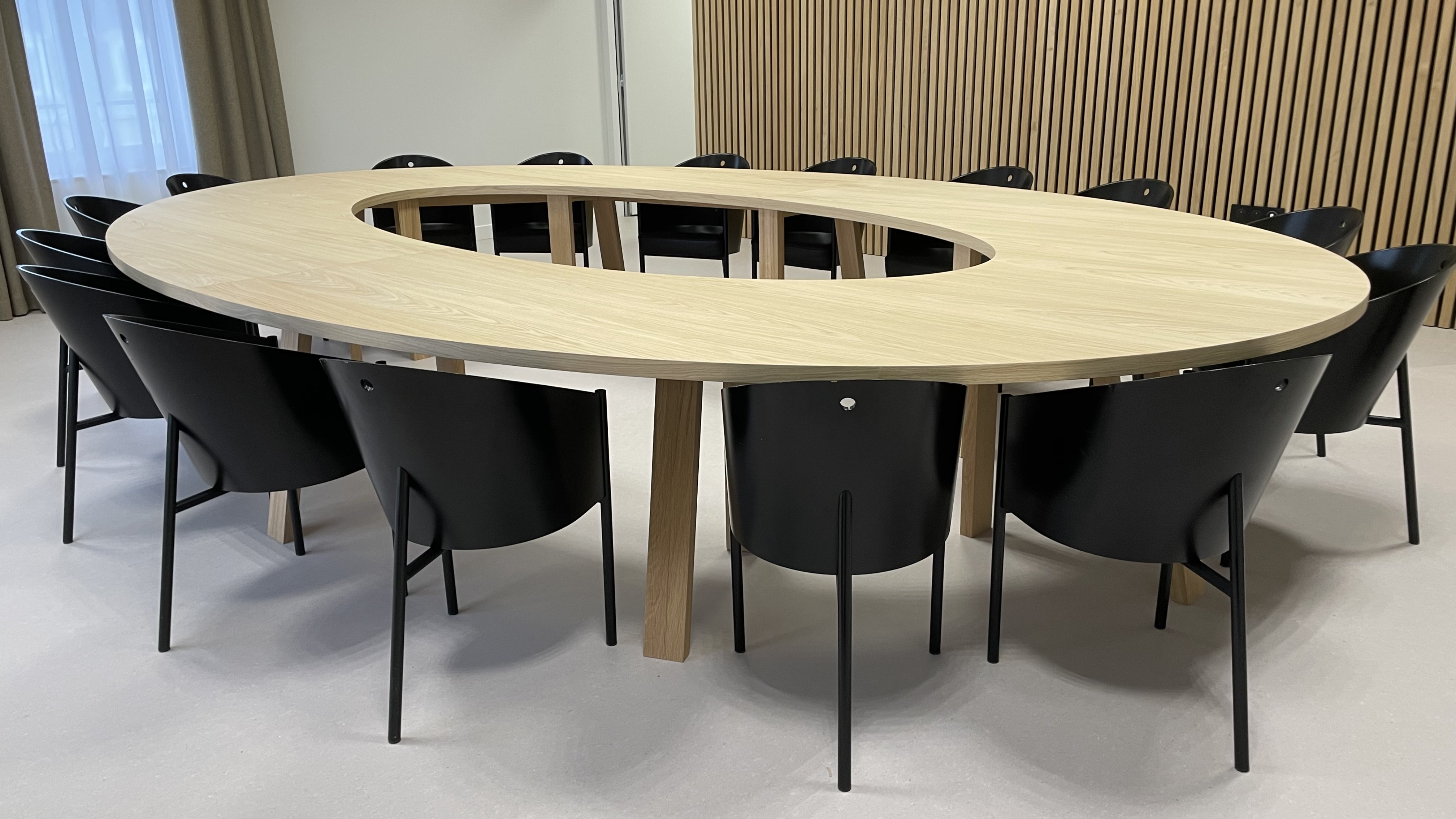 Le chêne massif provient de la forêt de Tronçais du département de l’Allier, la pierre naturelle des plans de travail est une pierre de Volvic, le mobilier existant en chêne de la salle du conseil a été restauré et en partie réadapté avec des équipements numériques intégrés.